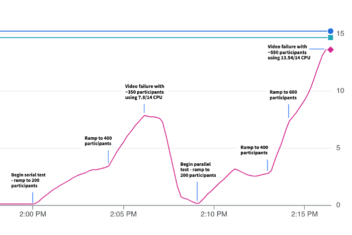 This utilization is demonstrated in the chart below — the left half shows the original serial method, which fails while using only around half of the 14 available cores. On the right side, we have the new load-balanced method, which is able to leverage the extra cores to handle another 200 participants. Both cases used a single publisher.