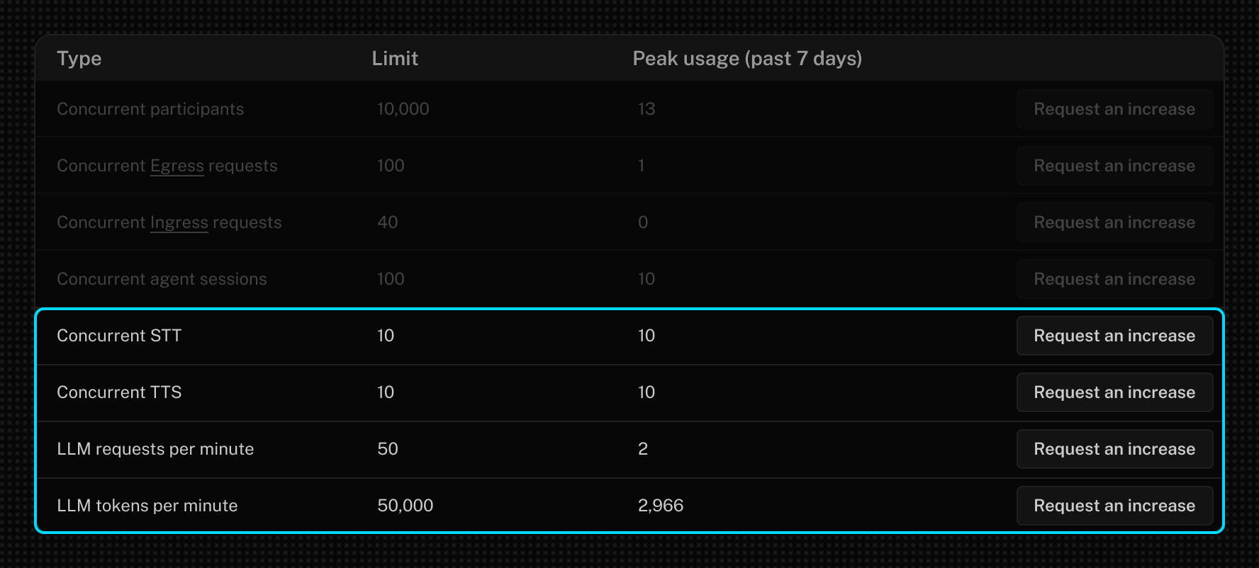 These limits become hard to track, especially as your voice agent starts to scale. You need visibility into your usage of a specific provider, and capacity planning is mostly guesswork.