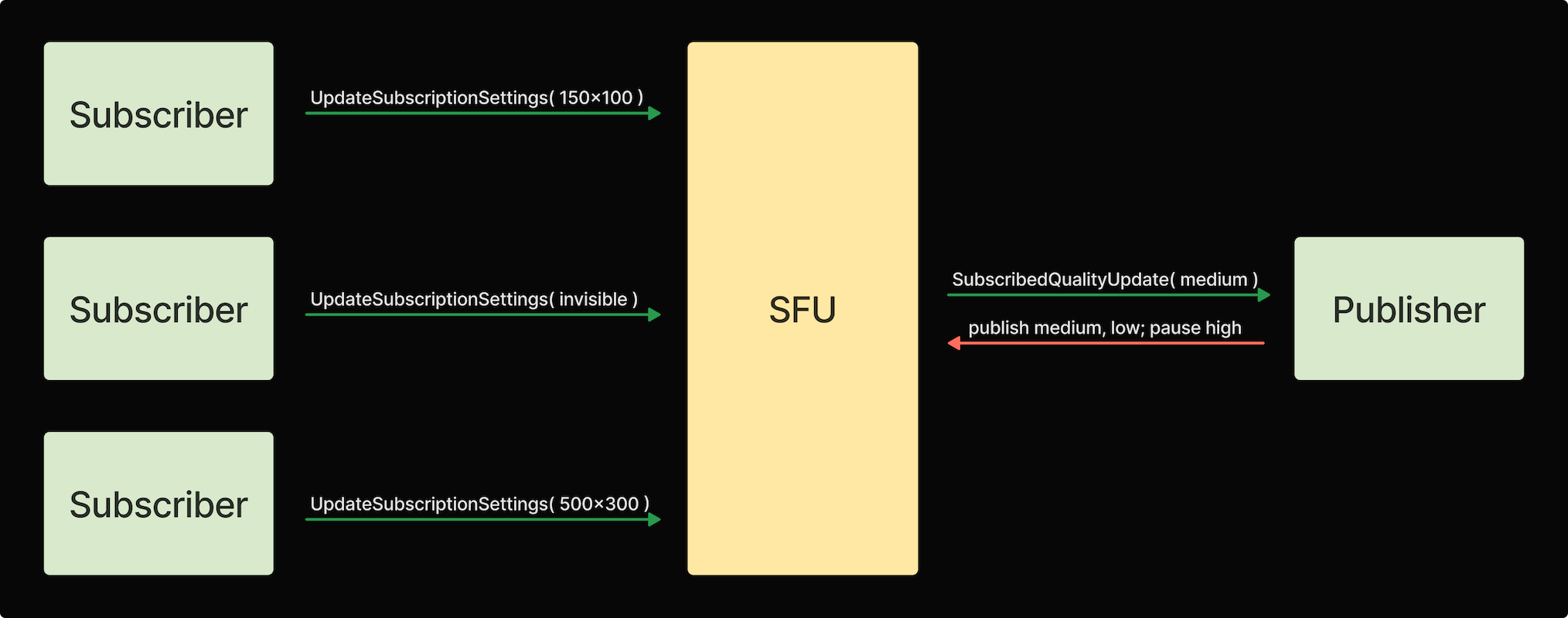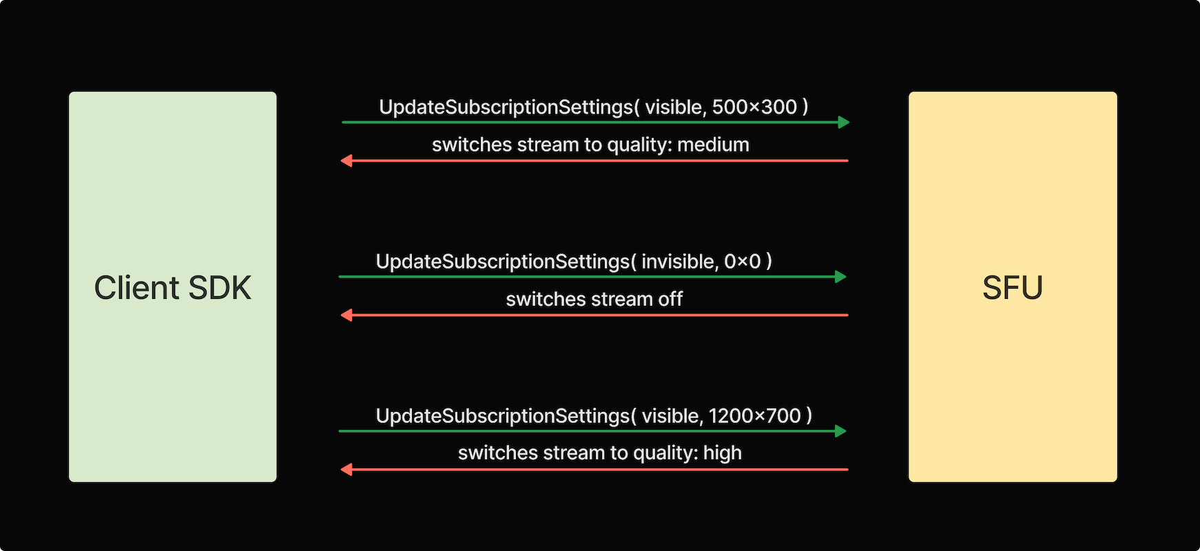 For each track, LiveKit aggregates subscriber information and notifies the publisher of the maximum quality they need to publish at any given moment. Our client SDK handles these messages and pauses or resumes each individual simulcast layer as needed. When no one is subscribed to a particular track, the publisher is instructed to stop publishing entirely!