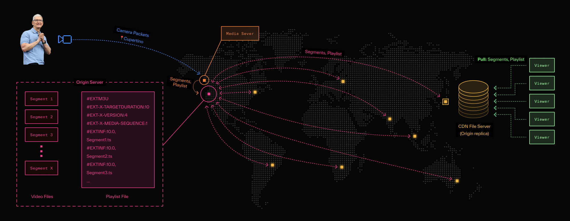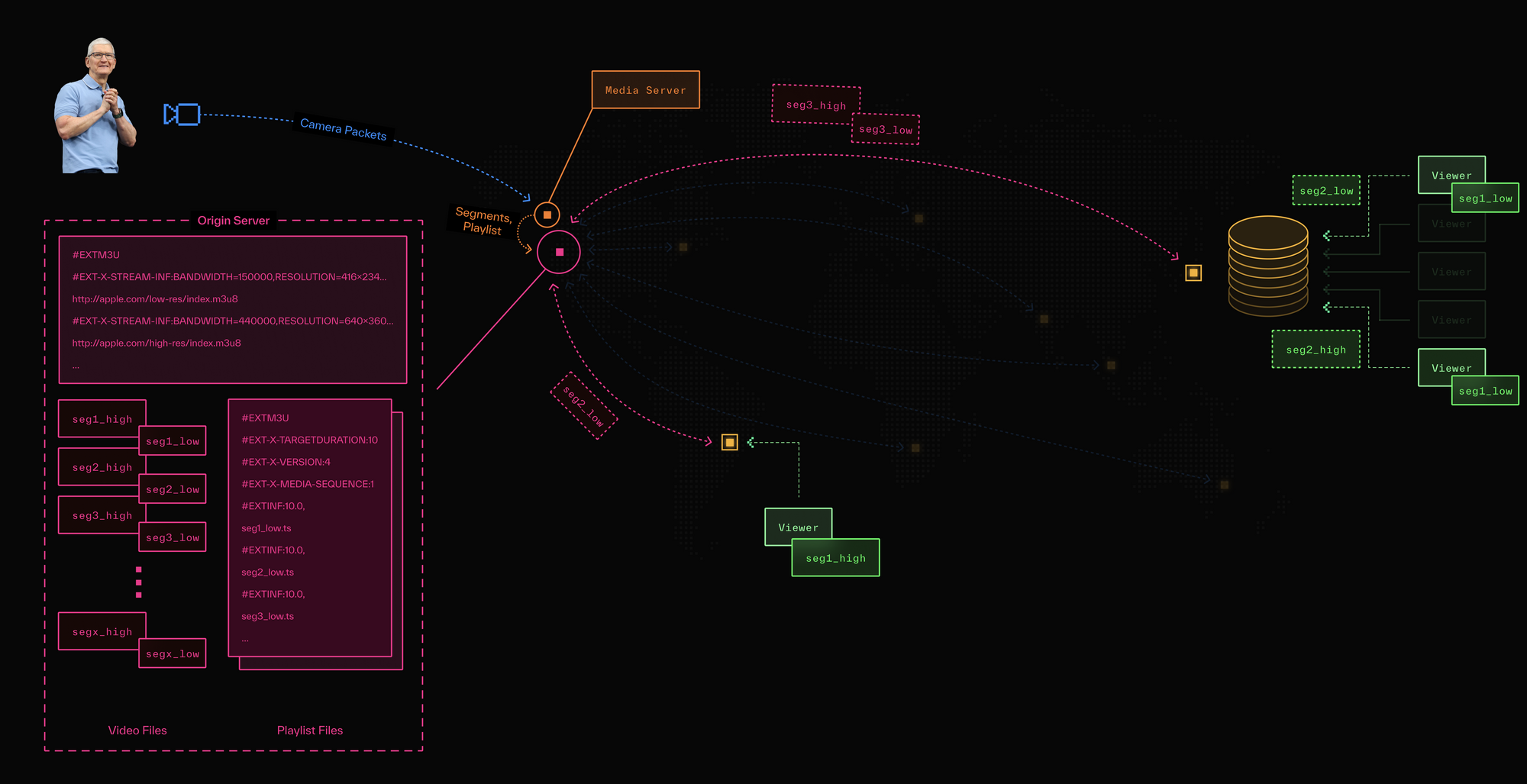 When you (or I) navigate to a webpage to watch the keynote, an HLS player (i.e. client) connects to the geographically closest file server, downloads the playlist file, finds a recent entry (denoting a recently recorded segment) and starts downloading and playing it. As new video files are recorded and the corresponding playlist is updated, those segments will be fetched by your client in the background and added to your local buffer for playback.