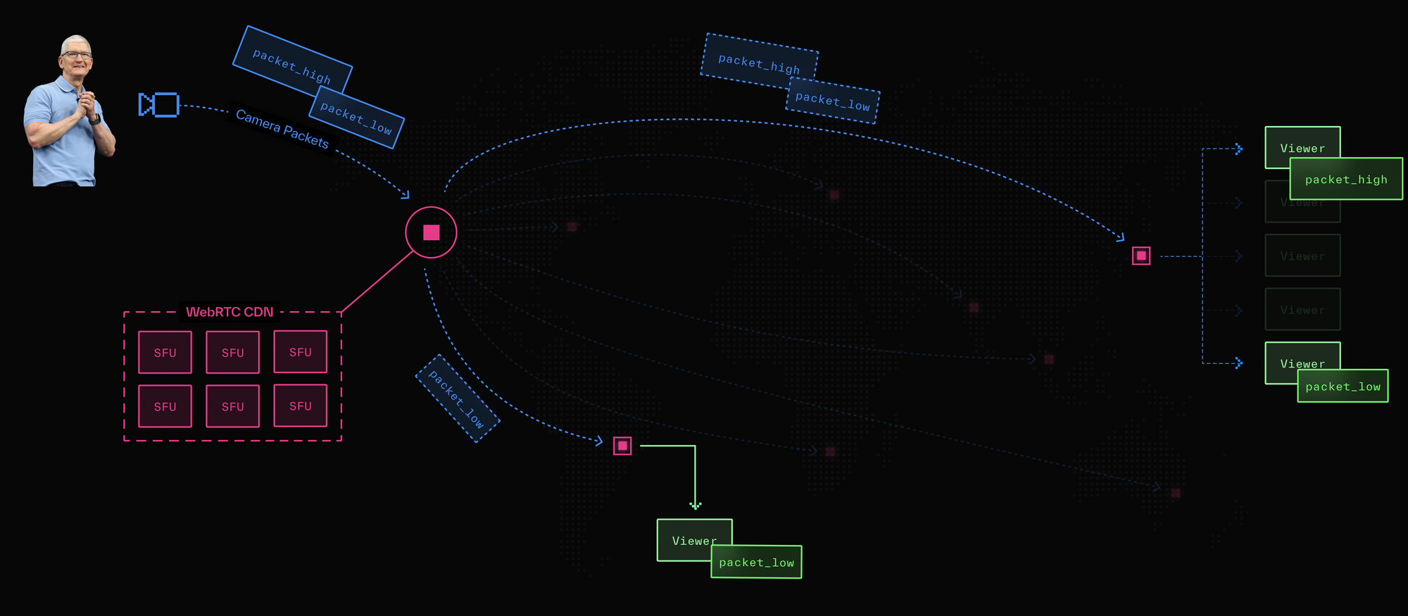 WebRTC relies on the more recent introduction of UDP sockets in browsers. In contrast to HLS, a WebRTC media server acts as a stateful router: a session or dedicated network path is first established between streamers and viewers, then media flows between them. If an Apple keynote used WebRTC, copies of video packets hot-off-the-camera are pushed directly to viewers by the media server.